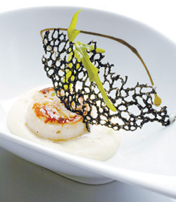 高腳杯裡裝著龍蝦凍,凍上覆著有幾顆鮭魚卵的花椰奶凍,杯子上架著麵線橋,橋上則有紅紅綠綠的花卉芽菜,想吃得完全,勢必拆橋毀凍,然而完美的剎那又在嘴裡重組;煙燻鮭魚捲成兩朵花兒似的登場,服務生稱之為:鮭魚披薩,因為底下墊著馬鈴薯蝦夷蔥油餅,裡面裹著大坨酸奶油,想吃乾抹淨,勢必得一口塞進嘴裡,不管花形與形象。