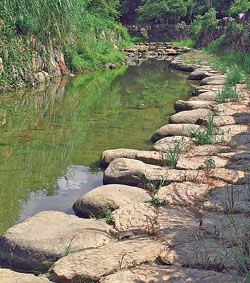 走康樂街,過忠三街口的公車總站,進入內溝溪上游起點,眼前是一幅截然不同於內湖市區的鄉村景致,葉菜、苗圃等農田遍布,農舍、竹林與濕地散布其間。半圓形的彎曲河道,可明顯觀察溪水沖刷面與堆積面的自然溪流現象,天氣好的時候,溪底的小魚蝦也歷歷可見。當年市府將溪底落差較大的低窪處填平,改變了溪底坡度與河道流向,使水流變得平緩,並在河道周圍以半生態工程的方式──以鋼筋水泥鋪底,在外觀包覆石頭,仿照舊時婦女在河邊浣衣的情境,用砌石在河床上鋪陳了寬闊的跳石、親水平台、步道、涼亭、原石護欄等。在這裡,溪畔戲水不只是繪本裡的美麗插畫,還是你我家常的生活記憶。