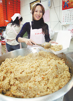 採訪當天真是個好日子,有客人為回門的女兒預訂甜米糕,老闆娘說有人訂才零賣,甜米糕揉合桂圓與二砂的甜蜜,誰都想藉由口福沾染喜氣。過年前10天開始忙炊粿,口味有:黑糖、紅豆、巧克力和鹹年糕等,也都是年節搶手貨。