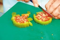 材料:紫蘇梅、白話梅、棉糖、工研白醋、黑柿番茄作法:1.取一大鍋,放入600公克的紫蘇梅2瓶、白話梅2碗、棉糖5公斤,以及工研白醋5瓶,調勻後封上保鮮膜,靜置7天熟成。(可按比例減量) 2.選台灣本土的大粒黑柿番茄,勿太熟太軟,切塊,淋上梅汁,食用時連汁一起入口。